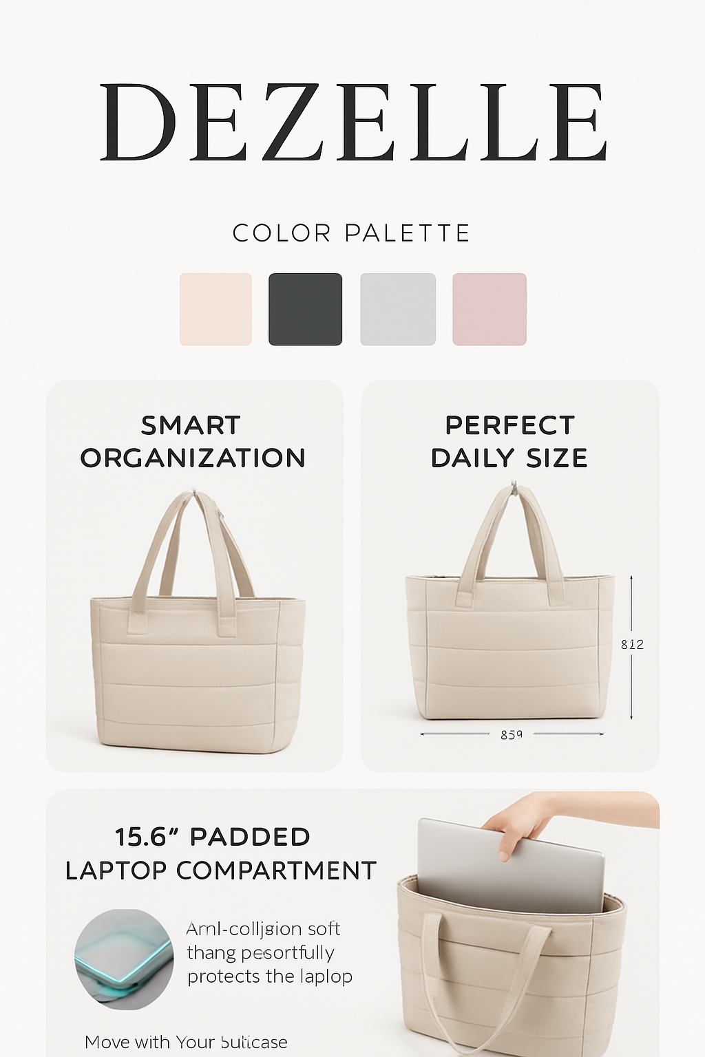 Dezelle Puff Tote blends luxury design with practical functionality. Unlike regular totes that feel messy or oversized, Dezelle is crafted with multiple compartments — including a 15.6” padded laptop section, smart interior pockets, and space for your daily essentials.